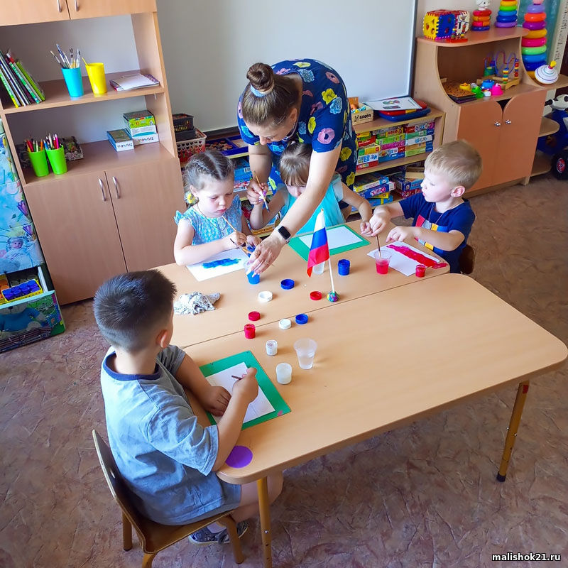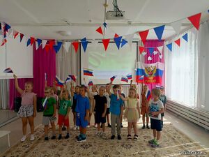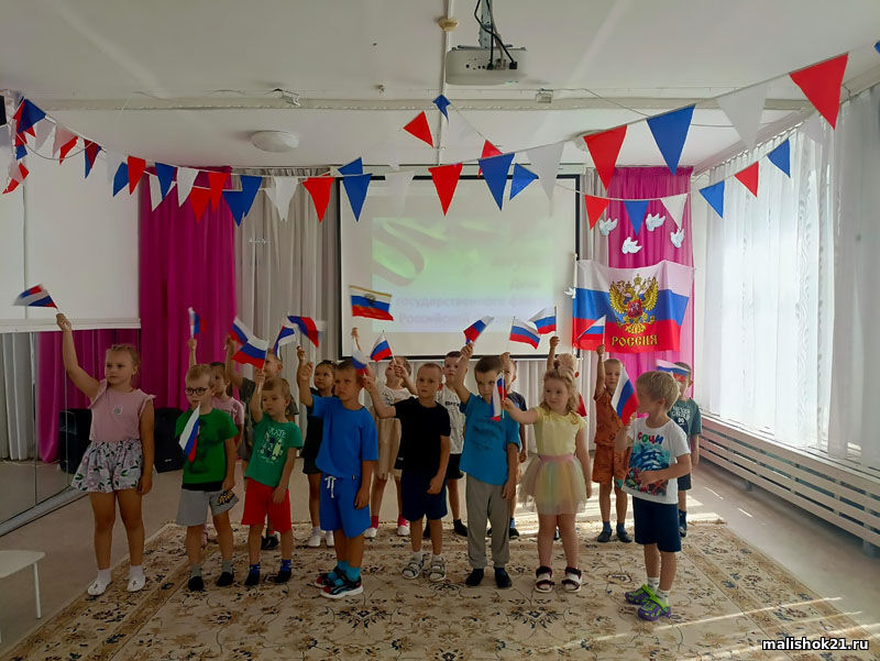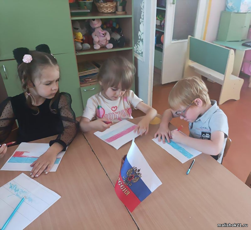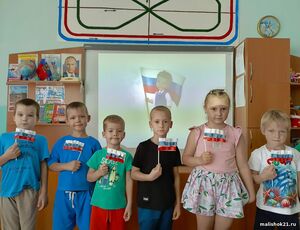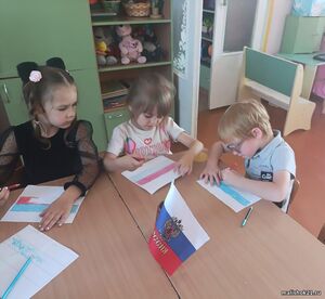 Педагоги закрепили с детьми знания о государственных символах России. Рассказывали об истории флага, почему он называется триколором, объясняли значение цветов российского флага, беседовали о стране, читали стихи о России. Дети узнали, почему граждане России гордятся Государственными гербом, флагом и гимном, что без этих отличительных знаков страны не обходится ни одно важное для страны событие, что Государственный флаг всегда поднимается во время торжественных мероприятий, праздников, и в это время звучит Гимн Российской Федерации.