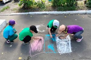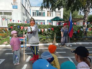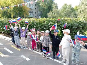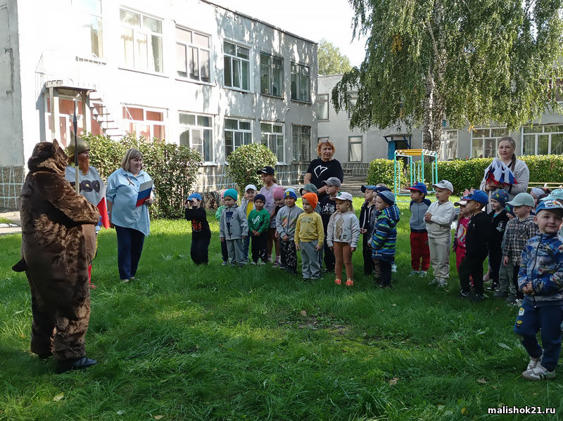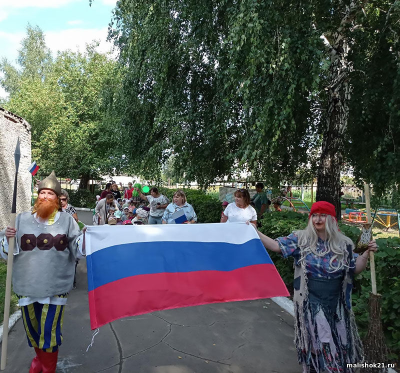 На прогулке дети групп «Сказка» и «Звездочка», «Кораблик» и «Теремок», «Колокольчик» участвовали в квест - игре «В поисках флага». С большим желанием и интересом большой дружной дружиной во главе с русским богатырем Ильей Муромцем воспитанники участвовали в эстафетах с перетягиванием каната, играх «Белый, синий, красный», «Море волнуется», выполнили все задания Кикиморы, отгадали загадки Бабы Яги. В заключении организовали праздничный флешмоб с флажками «Мы дети твои Россия».
