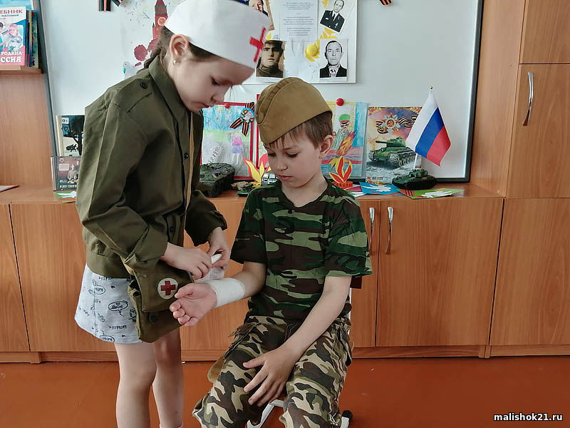В совместной деятельности с детьми были проведены тематические беседы о подвигах советских людей: «День Победы», «Что такое война», «Военные профессии». Педагоги читали детям художественную литературу о войне: «Шинель» Е. Благининой, «Памятник советскому солдату» Л. Кассиля, «Дозор» З.Александровой и др., а затем совместно обсуждали и высказывали свои полученные впечатления о прочитанном.