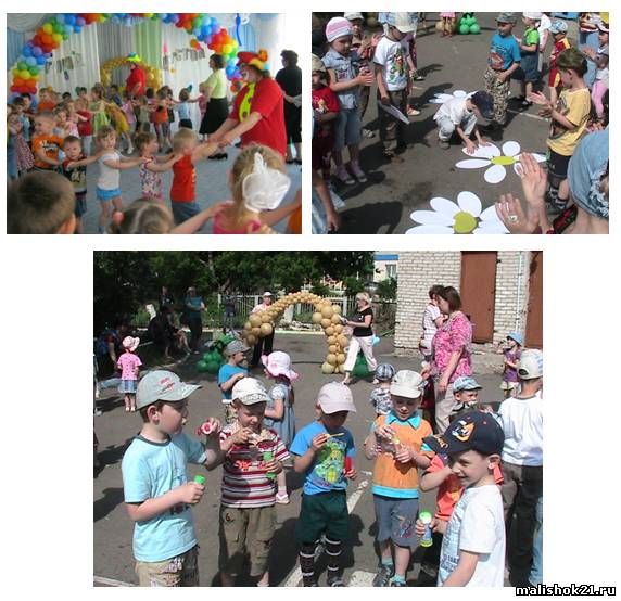 | Вот оно – яркое, зеленое, солнечное! Прекрасный солнечный день, светлые детские лица, радушие взрослых объединились в общий букет! Для детей групп «Облачко», «Одуванчик», «Звездочка», «Теремок», «Колокольчик» педагоги совместно с Ларионовой Т.И. – музыкальным руководителем подготовили яркий праздник, где их развлекали смешные клоуны (воспитатели: Канакина Н.И., Валиева О.О.), кот Лепольд (учитель-дефектолог Абузярова М.К.) со своими друзьями-мышами (воспитатели Харченко О.Н., Ктиторова М.В.).Дети с удовольствием танцевали, играли в игры, пели песенки.