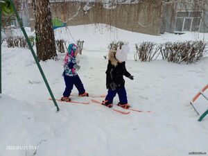 На прогулке дети учились правильно надевать лыжи, скользить, координировать свои движения. Лыжные прогулки развивают у детей координацию, внимание и чувство коллективизма: ребята помогают и поддерживают друг друга.