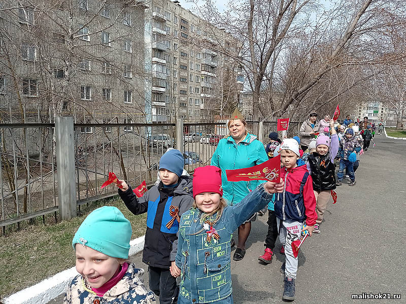 После успешного выполнения заданий все группы построились на парад, где выполнили упражнение «Салют, Победа!» и прошли торжественным маршем вокруг детского сада с громкими и радостными криками: «Ура!»